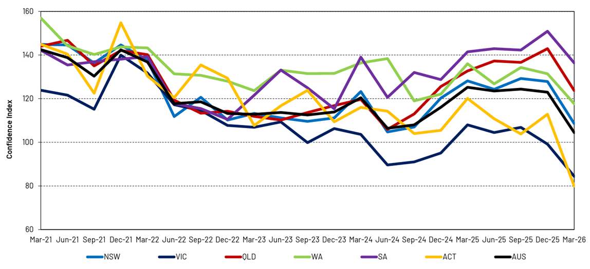The latest Procore/Property Council Industry Sentiment Survey recorded a fall in national confidence from about 123 to 104 in the March quarter. It was the largest quarterly drop since 2022.
